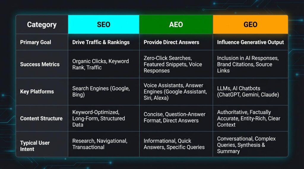 | Feature | SEO (Search Engine Optimization) | AEO (Answer Engine Optimization) | GEO (Generative Engine Optimization) |