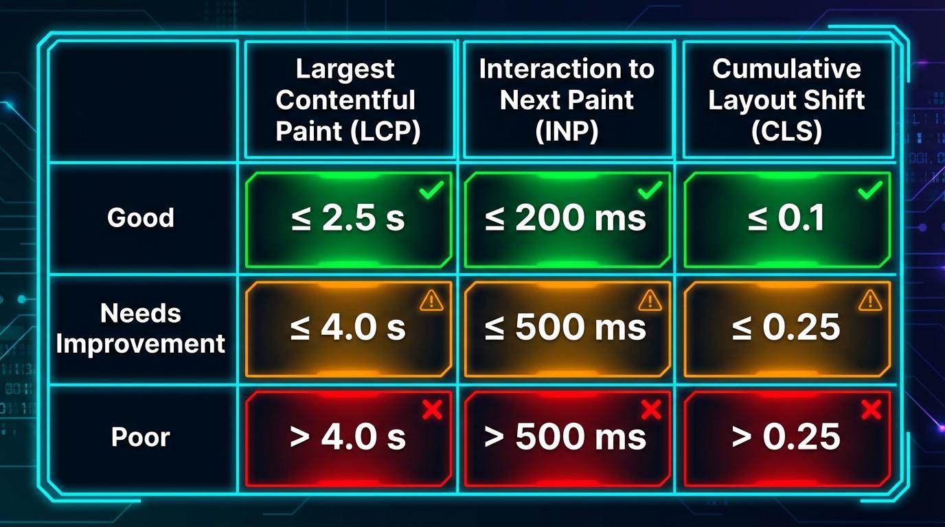 | INP (Responsiveness) | ≤ 200 milliseconds | 200ms – 500 milliseconds | > 500 milliseconds |