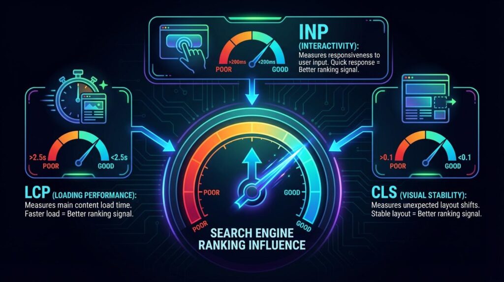 Your website’s performance is no longer a secondary concern; it is a direct component of search engine visibility and user satisfaction. This guide demystifies Google’s Core Web Vitals (CWV), detailing the specific measurements—Largest Contentful Paint (LCP), Interaction to Next Paint (INP), and Cumulative Layout Shift (CLS)—that define page experience for both users and search algorithms. You will learn how to audit your existing scores against established benchmarks, understand the profound linkage between these technical metrics and your search rankings across mobile and AI-driven results, and ultimately implement precise technical fixes to stabilize and improve your scores. Begin by familiarizing yourself with what these core metrics actually quantify so you can effectively diagnose and remedy performance bottlenecks.